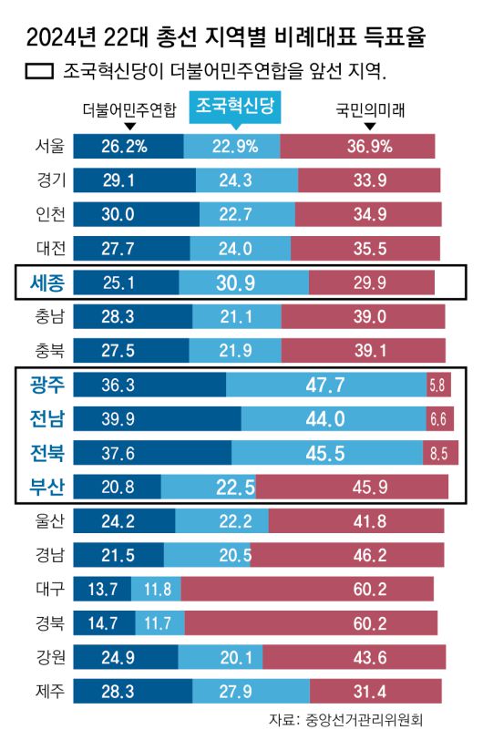 조국혁신당은 지난해 4·10총선에서 지역구 후보를 내지 않고 비례대표 투표로만 24.3%의 득표율로 12석을 따냈다. 이재명 대통령이 민주당 대표를 맡아 치른 총선에서 ‘지역구는 민주당, 비례대표는 조국혁신당’의 ‘지민비조’를 앞세운 조국혁신당은 전국 17개 시도 중 광주 전남 전북 세종 부산 등 5곳에서 민주당의 위성정당인 더불어민주연합을 앞섰다.