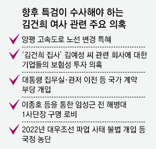 이에 특검 안팎에선 이번 김 여사의 구속영장 혐의에 포함되지 않은 집사 게이트, 양평고속도로 종점 변경 의혹 및 공흥지구 개발 사업 특혜 의혹, 대통령 관저 이전 의혹 등 김건희 특검의 수사 대상뿐 아니라 ‘임성근 구명 로비’ 의혹과 관련해 채 상병 특검에서도 김 여사를 겨냥한 수사가 동시다발적으로 이뤄질 것이란 전망이 나온다.