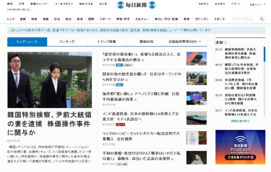 일본 마이니치신문은 13일 "윤 전 대통령의 아내 김건희 여사가 주가 조작과 관련한 자본시장법 위반 혐의 등으로 구속됐다"고 보도했다.