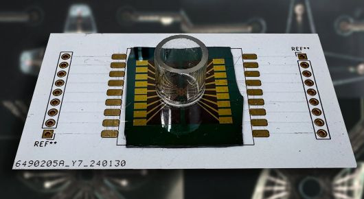 오가노이드 칩.가운데 투명한 실린더에 뇌 오가노이드가 있고, 주변에는 전극과 회로들이 연결돼 있다. 미국 존스홉킨스대 연구진은 살아있는 신경 조직과 하드웨어를 결합한 바이오 칩을 개발했다./미 존스홉킨스대 |