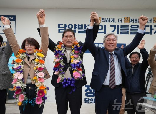 4·2재보궐선거에서 당선된 정철원 조국혁신당 담양군수 후보가 2일 오후 전남 담양군 담양읍 선거사무소에서 지지자들과 함께 기쁨을 나누고 있다. (정철원 후보 캠프 제공. 재판매 및 DB 금지) 2025.4.2/뉴스1 ⓒ News1 |