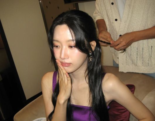 공개된 사진 속 문가영은 보라색 드레스를 입고 헤어를 손보고 있는 모습이다. 민소매의 고급스러운 드레스가 우아한 그녀와 잘 어울린다. 그녀는 손을 입술 옆에 갖다 대 뾰로통한 표정을 짓고 있다.