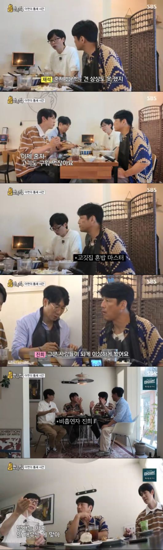 그리고 이날 유재석, 지석진, 지진희는 옛날 이야기에 푹 빠졌다. 혼밥족들을 위한 1인 자리가 많이 마련되어있는 식당을 본 유재석은 "옛날에는 혼자 밥을 먹는건 상상을 못했다"고 했고, 지진희도 "혼자 고기를 구워먹으면 이상하게 쳐다봤었다"고 공감했다.