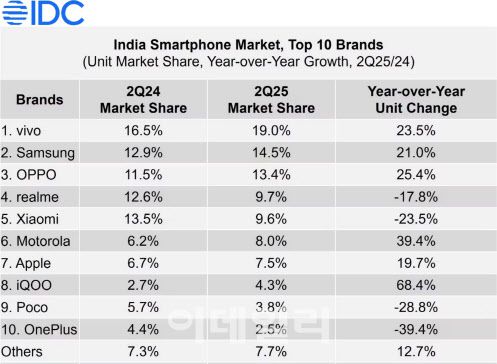 [이데일리 윤정훈 기자]삼성전자(005930)가 2025년 상반기 인도 스마트폰 시장에서 2위를 지켰다. 1위는 가성비를 앞세운 중국 비보가 차지했다.