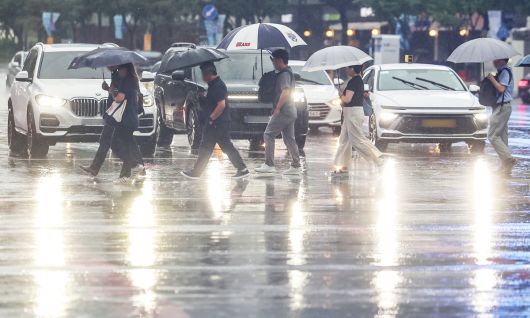 서울에 호우주의보가 내린 13일 서울 종로구 광화문네거리에서 우산을 쓴 시민들이 출근길 발걸음을 재촉하고 있다. 뉴스1 |