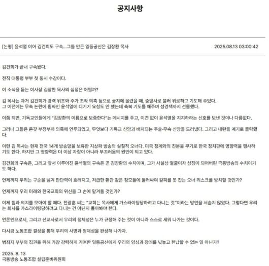 극동방송노조준비위는 13일 새벽 "김건희가 끝내 구속됐다"는 제목의 글을 노조설립준비위 홈페이지에 올리고 이같이 논평했다.