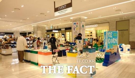 경기도 업사이클플라자 입주 기업인 '동네형'이 현대백화점 천호점과 협업해 선보인 '플라스틱 리본(Plastic Reborn)' 팝업스토어를 찾은 방문객들이 상품을 둘러 보고 있다. /경기환경에너지진흥원 |