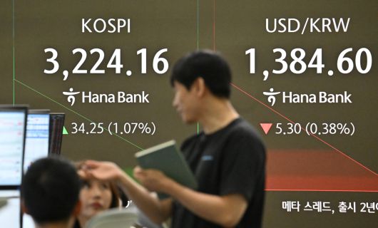 코스피가 13일 3200선을 회복하며 상승 출발했다. 간밤 발표된 미국 소비자 물가지수(CPI)가 예상치에 부합하며 인플레이션 불안감이 낮아진 것과 더불어 9월 FOMC를 통한 금리인하 기대감이 확대되며 미국 증시가 일제히 상승 마감한 영향으로 풀이된다. 이날 오전 서울 중구 하나은행 딜링룸 전광판에 코스피 지수가 오전 9시 9분 기준 전 거래일보다 34.25포인트 상승한 3224.16포인트를 나타내고 있다. 원·달러 환율은 1384.60원이다. 임세준 기자 |