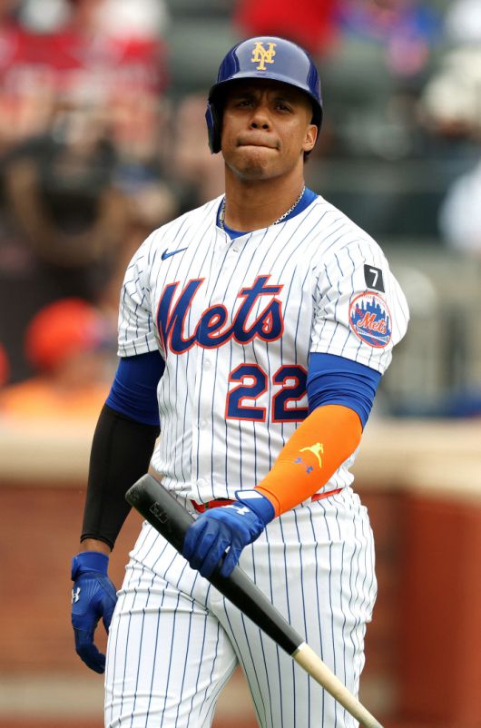 뉴욕 메츠 후안 소토가 지난 7일(한국시각) 클리블랜드 가디언스전에서 3회 삼진을 당한 뒤 입을 꽉 다문 채 물러나고 있다. AFP연합뉴스 |