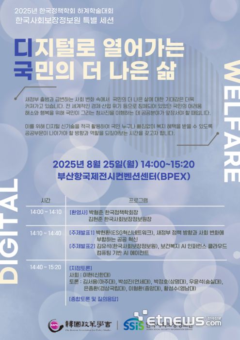한국사회보장정보원은 오는 25일부터 26일까지 부산항국제전시컨벤션센터(BPEX)에서 열리는 '2025 한국정책학회 하계학술대회'에서 '디지털로 열어가는 국민의 더 나은 삶'을 주제로 특별세션을 운영한다고 13일 밝혔다.
