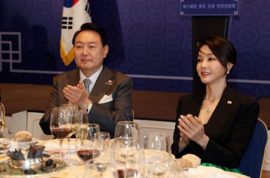 윤석열 전 대통령과 김건희 여사가 지난 2022년 6월 29일(현지시간) 스페인 마드리드 만다린 오리엔탈 리츠호텔에서 열린 동포 만찬간담회에서 박수를 치고 있다.김 여사는 논란이 된 '반 클리프 아펠' 목걸이를 착용한 채 앉아 있다. 연합뉴스 |