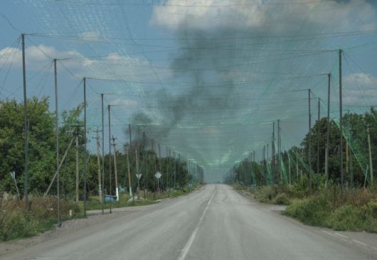 10일(현지시간), 우크라이나 도네츠크 지역에서 러시아가 우크라이나를 공격한 가운데, 도브로필리아 최전선 인근 도로에 설치된 드론 방지 그물망의 모습./로이터 연합 |