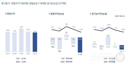 펄어비스의 2분기 실적은 매출 796억원으로 지난 분기 대비 4.9%, 전년 동기 대비 2.7% 감소했다. 또한 영업이익은 지난 분기에 이어 적자폭이 확대되면서 118억원의 손실을 기록했다. 해외 매출 비중은 82%를 차지했다.