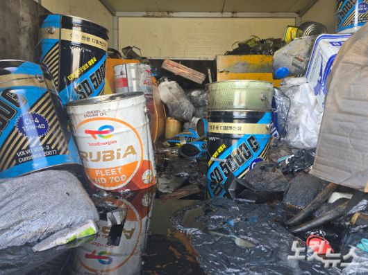 내부에는 기름통들이 난잡하게 쌓여 있고, 시커멓게 찌들어있는 폐유 수거통은 절반 이상 차 악취를 풍긴다. 바닥은 기름과 모래가 엉겨 붙어 취재진의 신발이 달라붙을 정도로 끈적거린다.