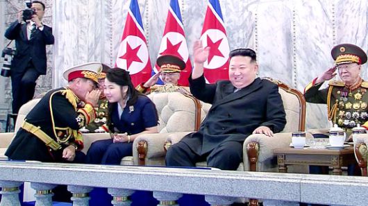 2023년 9월 8일 평양 김일성광장에서 열린 북한 정권수립 75주년 민방위무력 열병식에서 김정은 북한 국무위원장과 나란히 앉은 김주애에게 박정천 당 군정지도부장이 무릎을 꿇고 귓속말을 전하고 있다. 연합뉴스 |