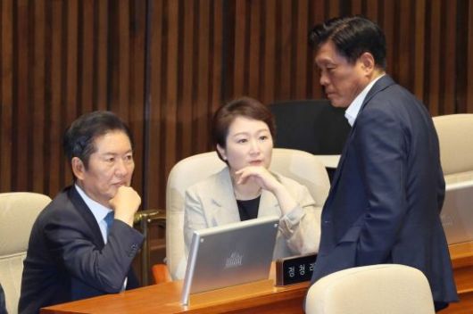 정청래 더불어민주당 대표와 이언주 최고위원, 조승래 사무총장이 5일 국회에서 열린 본회의에서 대화하고 있다. 김현민 기자 |