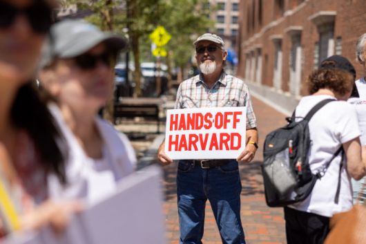 7월 21일, 시위대가 보스턴의 존 조지프 모클리 연방 법원 앞에 모이고 있다. 이날 하버드대학교 변호인단은 연방 법원에서, 연방 정부가 20억 달러가 넘는 보조금과 계약을 동결한 것은 불법이며 이를 철회해야 한다고 주장했다.(사진=게티이미지) |