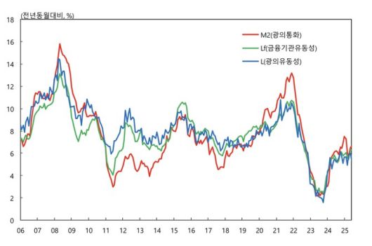 한국은행이 13일 발표한 '2025년 6월 통화 및 유동성'에 따르면 올해 6월 시중통화량 평균잔액은 광의통화(M2) 기준 4307조5000억원으로 한달 전과 비교해 27조1000억원 증가했다.