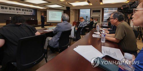 (서울=연합뉴스) 박건영 기자 = 우키시마호 승선자 유가족들이 13일 서울 중구 한국프레스센터에서 열린 승선자 명부 분석 경과보고회에서 심규선 일제강제동원피해자지원재단 이사장의 설명을 듣고 있다. 2025.8.13