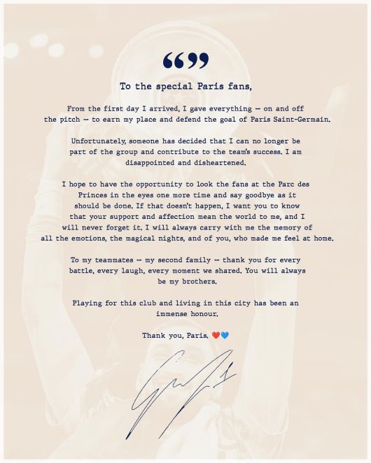 이어 "나는 항상 모든 감정과 마법 같은 순간의 기억을 품고 있을 거다. 집처럼 느끼게 해준 여러분들을 간직할 것"이라며 "두 번째 가족인 동료들에게도 모든 경기, 웃음 함께 한 순간에 감사하다. 항상 형제들일 것이다. 이 구단에서 뛰며 이 도시에 산 것은 엄청난 영광이다. 고마워 파리"라고 마지막 인사를 전했다.