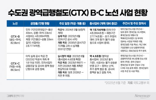 수도권 광역급행철도(GTX) B·C 노선은 같은 민자사업이지만 속도와 방향은 극명히 갈렸다. GTX-B는 착공을 향해 속도를 내고 있지만, GTX-C는 착공식 이후 1년 넘게 발이 묶여 있다.