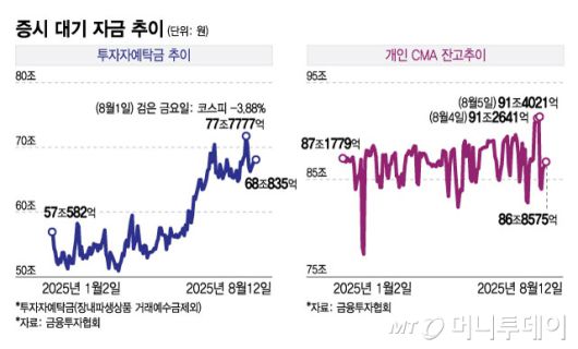 전날 기준 CMA 잔고도 약 86조8500억원을 기록했다. CMA는 수시입출금이 가능하고 하루만 투자해도 이자를 받을 수 있어 개인들이 마땅한 투자처를 찾지 못할 때 자금을 보관하는 용도로 사용된다. 이날 하루에만 투자자예탁금과 CMA 잔액을 합한 증시 대기자금은 약 154조9400억원에 달한다. 특히 지난 4일과 5일 기준 CMA잔고는 91조원대까지 불어났다.
