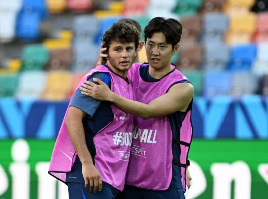파리 생제르맹 이강인이 14일(한국시간) 이탈리아 우디네 스타디오 프리울리 스타디움에서 진행한 2025 유럽축구연맹(UEFA) 슈퍼컵 대비 팀 훈련에서 주앙 네베스와 대화하고 있다. 로이터 연합뉴스 |