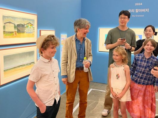 세계적인 그림책 작가 앤서니 브라운(왼쪽 2번째)이 13일 서울 서초구 예술의전당 한가람미술관에서 자신의 전시회를 가족들과 둘러보고 있다. 사진 아트센터 이다 |