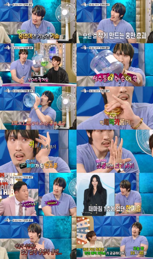 이주승이 13L짜리 생수통을 한 손으로 잡기에 도전해 보지만 실패하자, 최홍만은 “우리나라에서 저만 잡을 수 있어요.”라며 자신감을 보인다. 이어 그는 마치 1.3L짜리 생수병을 잡듯 한 손으로 들고 마시는 장면을 선보여 모두를 깜짝 놀라게 한다.