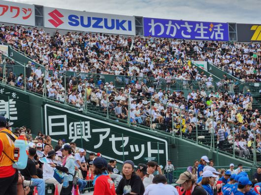 승리가 눈앞에 다가온 9회초, 투아웃 상황에서 볼넷을 허용했다. “니시무라 힘내라!” 관중석 여기저기에서 응원이 터져나왔다. 니시무라는 마지막 타자를 좌익수 플라이로 잡아 6-3 승리를 확정지었다. 1700여명의 응원단은 큰 함성으로 환호했고, 한국어 교가가 올해도 고시엔 구장에 울려퍼졌다. 관중석에서도 큰 박수가 쏟아졌다.