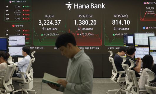 코스피가 전장보다 34.46p(1.08%) 오른 3224.37로 마감한 13일 오후 서울 중구 하나은행 딜링룸에서 딜러들이 업무를 보고 있다. 이날 원/달러 환율은 오후3시30분 기준 전날보다 8.2원 내린 1381.7원을 기록했고, 코스닥은 6.91p(0.86%) 오른 814.10로 마감했다. 연합뉴스 |