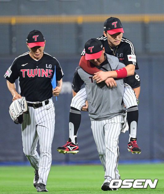[OSEN=수원, 최규한 기자] 12일 경기도 수원 KT위즈파크에서 ‘2025 신한 SOL Bank KBO리그’ KT 위즈와 LG 트윈스의 경기가 열렸다.홈팀 KT는 오원석, 방문팀 LG는 앤더스 톨허스트를 선발로 내세웠다.8회말 2사 1, 2루 상황 KT 오윤석의 추격의 2타점 3루타 때 LG 중견수 박해민이 타구를 쫓다 부상으로 스태프에게 업힌 채 교체되고 있다. 2025.08.12 / dreamer@osen.co.kr