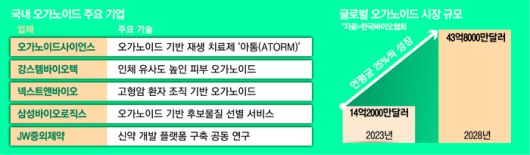 국내에서는 오가노이드사이언스, 넥스트앤바이오, 강스템바이오텍 등이 오가노이드 기술을 개발하고 있다. 국내 오가노이드 분야의 선두주자로 꼽히는 오가노이드사이언스는 오가노이드 기반 재생 치료제 ‘아톰(ATORM)’을 보유하고 있다.