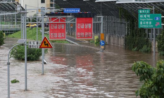 집중호우가 내린 13일 서울 노원구 월계1교 인근 중랑천이 범람해 동부간선도로가 물에 잠겨있다. 연합뉴스 |