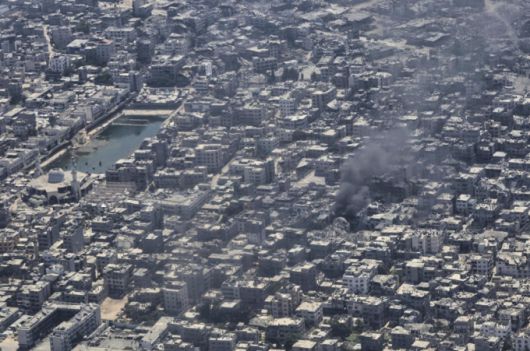 7일(현지시간) 팔레스타인인들을 위한 인도적 지원 물품을 공중 투하하던 요르단 공군 C-130 수송기에서 바라본 가자지구 가자시티에서 연기가 치솟고 있다. /AP=뉴시스 |