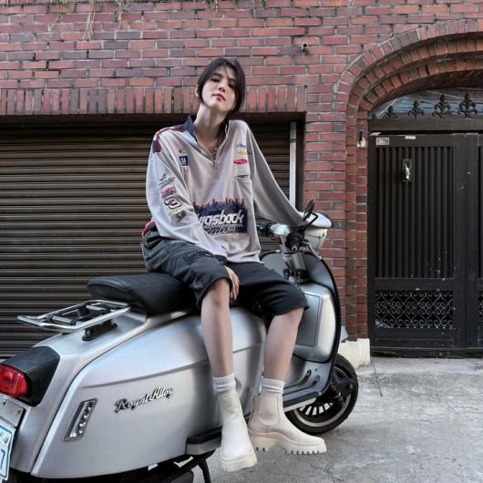한소희는 최근 자신의 SNS에 오버핏 레이싱 셔츠와 헐렁한 블랙 쇼츠, 두툼한 크림색 앵클부츠를 매치한 채 은색 바이크 위에 앉아 있는 모습을 공개했다.