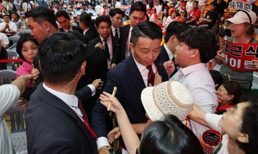 13일 오후 대전 서구 배재대학교에서 열린 국민의힘 충청·호남권 합동연설회에서 일부 지지자들이 마찰을 빚고 있다. 연합뉴스