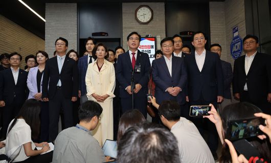 “전형적 야당 탄압이자 정치 보복” 국민의힘 송언석 비상대책위원장 겸 원내대표(가운데)가 13일 서울 여의도 당사에서 김건희씨 의혹을 수사 중인 민중기 특별검사팀의 당사 압수수색을 반대하는 입장을 밝히고 있다. 연합뉴스 |