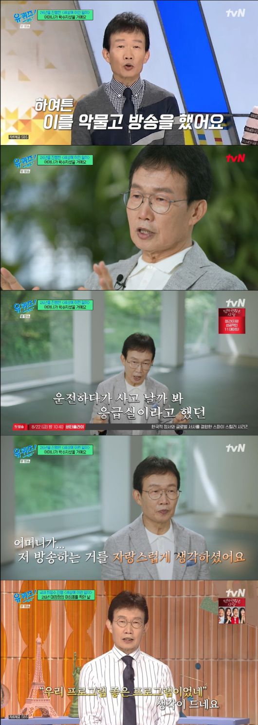 그는 "여동생 부부가 캐나다에서 산다. 어머니가 여동생을 따라 캐나다로 이민을 가셨는데 갑자기 연락을 받았다. 방송국에 다시 전화해 '내일 녹화하러 갈게요'라 했다. 그래서 비행기표를 바꾸고 녹화를 하러 갔다. 눈이 말도 못하게 부었다. 방송할 얼굴이 아니었다. 하필 마지막이 노모에게 효도하는 아들 사연이었다. 그걸 보는 순간에 참았던 눈물이 올라왔다. 녹화를 잠시 쉬었다가 다시 시작했다"라며 그때가 생각난듯 울컥했다.