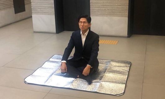 은색 돗자리를 깔고 당사 1층 로비에서 철야 농성에 돌입한 김 후보는 “특검의 압수수색은 개인정보보호 의무를 위반하고 정당 활동의 자유를 짓밟는 반민주적·반인권적 만행”이라며 “당원의 신념과 양심까지 권력의 잣대로 재단하는 야만적 약탈 행위”라고 비판했다.