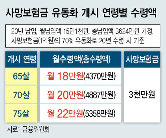 정부가 사망보험금을 연금 형태로 미리 받을 수 있는 ‘사망보험금 유동화’ 적용 나이를 기존 65살에서 55살로 10년 낮추기로 했다. 주된 퇴직연령과 국민연금 수령 시점(65살) 사이의 소득 공백기에 활용할 수 있도록 하려는 조처다.
