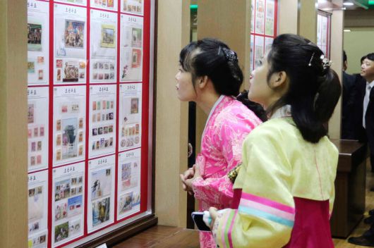 [평양=AP/뉴시스] 12일 북한 평양 조선우표전시장에서 조국해방 80돌 경축 우표 전람회가 열려 시민들이 전시된 우표를 둘러보고 있다. 2025.08.13. |