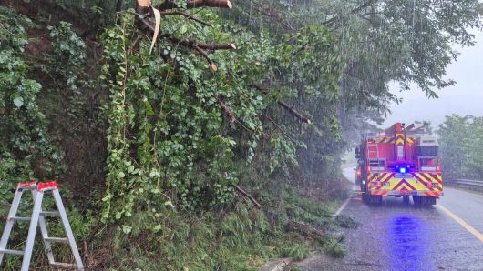 집중호우가 이어진 지난 13일 오후 2시쯤 강원 철원군 갈말읍 내대리의 한 도로에 나무가 쓰러져 있다. 강원도소방본부 제공 |