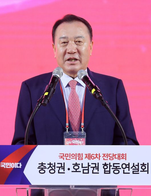 엄태영 충북도당위원장이 13일 대전 배재대에서 열린 국민의힘 제6차 전당대회 충청·호남 합동연설회에서 인사말을 하고 있다. 엄 위원장은 이날 인사말에서 “아직도 12·3 비상계엄을 옹호하거나 부정선거 음모론을 떠드는 사람들은 정신을 차려라"라고 말했다. 신현종 기자 |