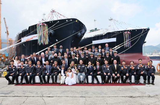 김정관 산업통상자원부 장관이 14일 경남 거제 한화오션 거제사업장에서 진행된 2척의 LNG 운반선 명명식에서 참석자들과 기념촬영을 하고 있다. [산업통상자원부 제공] |