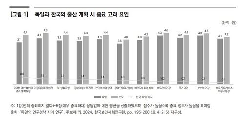 (서울=연합뉴스) 고미혜 기자 = 한국의 젊은 층이 독일, 일본, 프랑스, 스웨덴의 동년배에 비해 자녀 출산 결정에 고려하는 요소들이 많고, 출산으로 인한 경제적 부담이나 기회 제약에 대한 우려도 큰 것으로 나타났다.