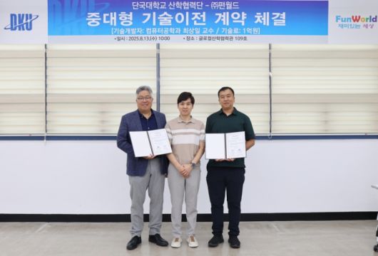 조완제 단국대 산학협력단장, 최상일 컴퓨터공학과 교수, 유경환 펀월드 대표.(왼쪽부터)/사진제공=단국대 |