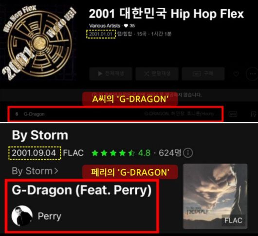 'G-DRAGON'은 힙합 컴필레이션 앨범 '2001 대한민국 힙합 플렉스'에 수록된 곡이다. 지난 2001년 저작권협회에 등록됐다. A씨가 작곡과 편곡에 이름을 올렸다.