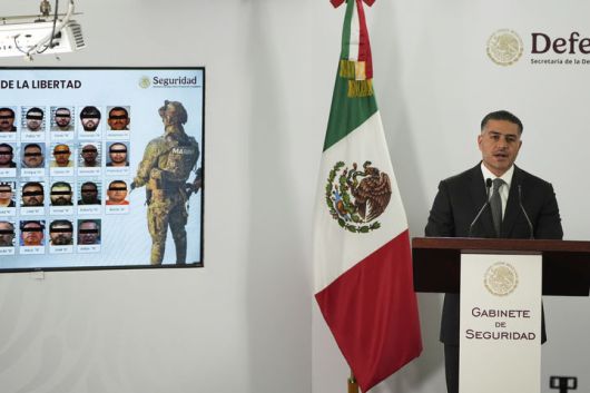[멕시코시티=AP/뉴시스] 오마르 가르시아 하르푸치 멕시코 안보장관이 13일(현지 시간) 멕시코시티에서 마약 카르텔 조직원 26명 미국 인도에 관한 기자회견을 하고 있다. 2025.08.14. |
