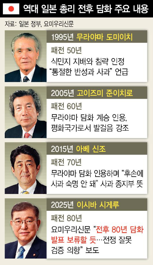 일본에선 패전 50주년인 1995년 각의 결정(국무회의 의결)을 통해 무라야마 도미이치 총리가 식민 지배와 주변국 침략에 대한 반성 및 사죄를 명시한 ‘무라야마 담화’를 발표한 이후, 역대 일본 내각이 10년마다 이를 계승한다는 취지의 ‘전후 담화’를 발표했다. 하지만 전후 80년인 올해는 정치적 기반이 약한 데다, 최근 퇴진 위기까지 몰린 이시바 총리가 당내 강경 보수층 반발에 부딪혀 각의 결정을 통한 ‘총리 담화’를 내지 않는다는 방침을 굳혔다. 총리 담화를 내려면 이미 했어야할 전문가 회의 등 절차도 진행하지 못했다.